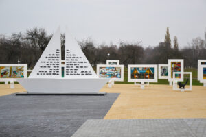 Открывает мемориал скульптура девочки, одиноко стоящей посреди площади. Центром композиции мемориального ансамбля является «Площадь Солнца». По центру площади высажен яблоневый сад, от которого в разные стороны расходятся аллеи – лучи этого солнца. Один из лучей черного цвета, он проходит через пустой класс из белых парт и школьной доски, где находятся витражи с рисунками детей, выполненных в концлагерях, и носит название «Луч памяти». По центру доски мечта детства – «Белый парусник».